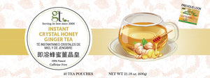 This high quality Ginger Tea is prepared from the finest ingredients and is processed with a new technique that allows the fragrance and all the natural essences of ginger to be preserved. Instant Crystal Honey Ginger Tea is caffeinated free and naturally flavored with a bit of honey for sweetness, making this aromatic tea the ideal beverage for anytime of the day and not just for medicinal use. For a bolder spicier Ginger flavor, try our Instant Crystal Honey Ginger Tea (Extra Strength). No artificial colors, sweeteners and preservatives added.