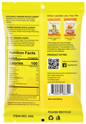 Our All in One Ginger Candy Variety Pack. Each bag contains a few pieces of our Amber Ginger Rock(customer favorite), Honey Ginger Candy and our newest addition, Coconut Ginger Rock Candy.