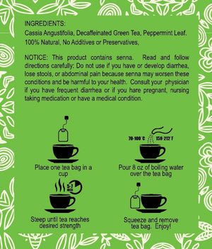 This decaffeinated blend of Green Tea, Papaya, and Peppermint Leaf is an ancient oriental dietary recipe containing Cassia Angustifolia. This main ingredient together with Green Tea is used as a stimulant and diuretic to assist the body in ridding itself of toxins naturally. Extra bowel movements may be experienced for the first few days.*