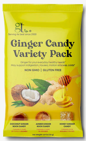 Our All in One Ginger Candy Variety Pack. Each bag contains a few pieces of our Amber Ginger Rock(customer favorite), Honey Ginger Candy and our newest addition, Coconut Ginger Rock Candy.